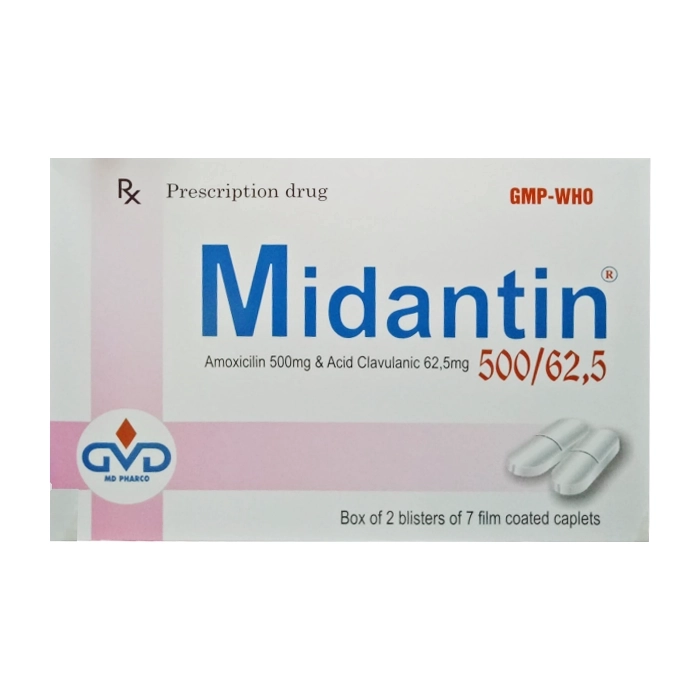 Midantin 500/62.5 Minh Dân 2 vỉ x 7 viên (Amoxicillin Acid clavulanic)